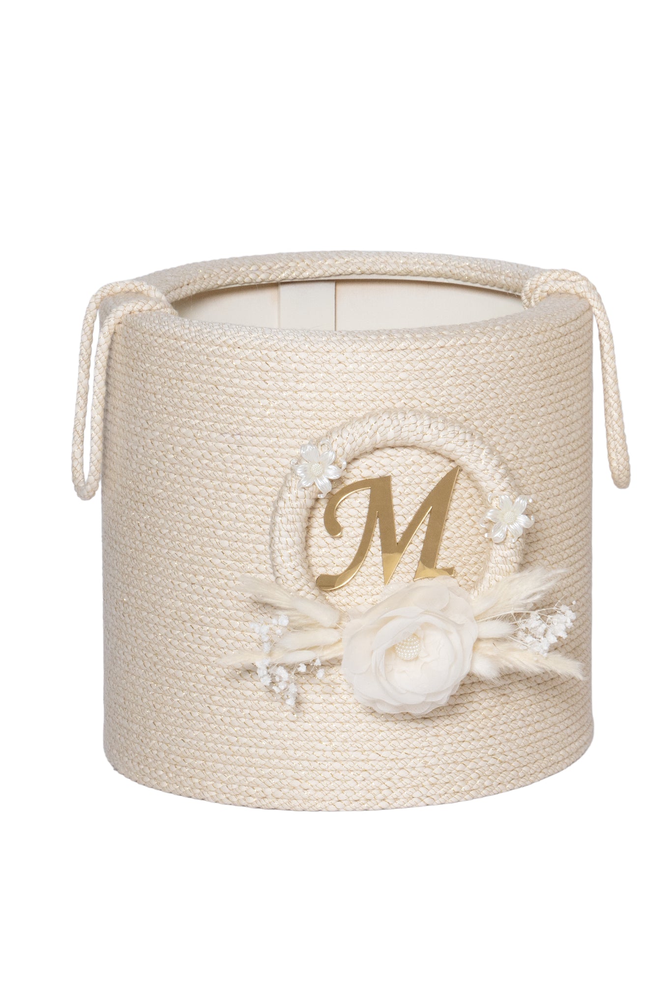 Βαπτιστικό ξύλινο καλάθι, επενδυμένο με γυαλιστερό κορδόνι.