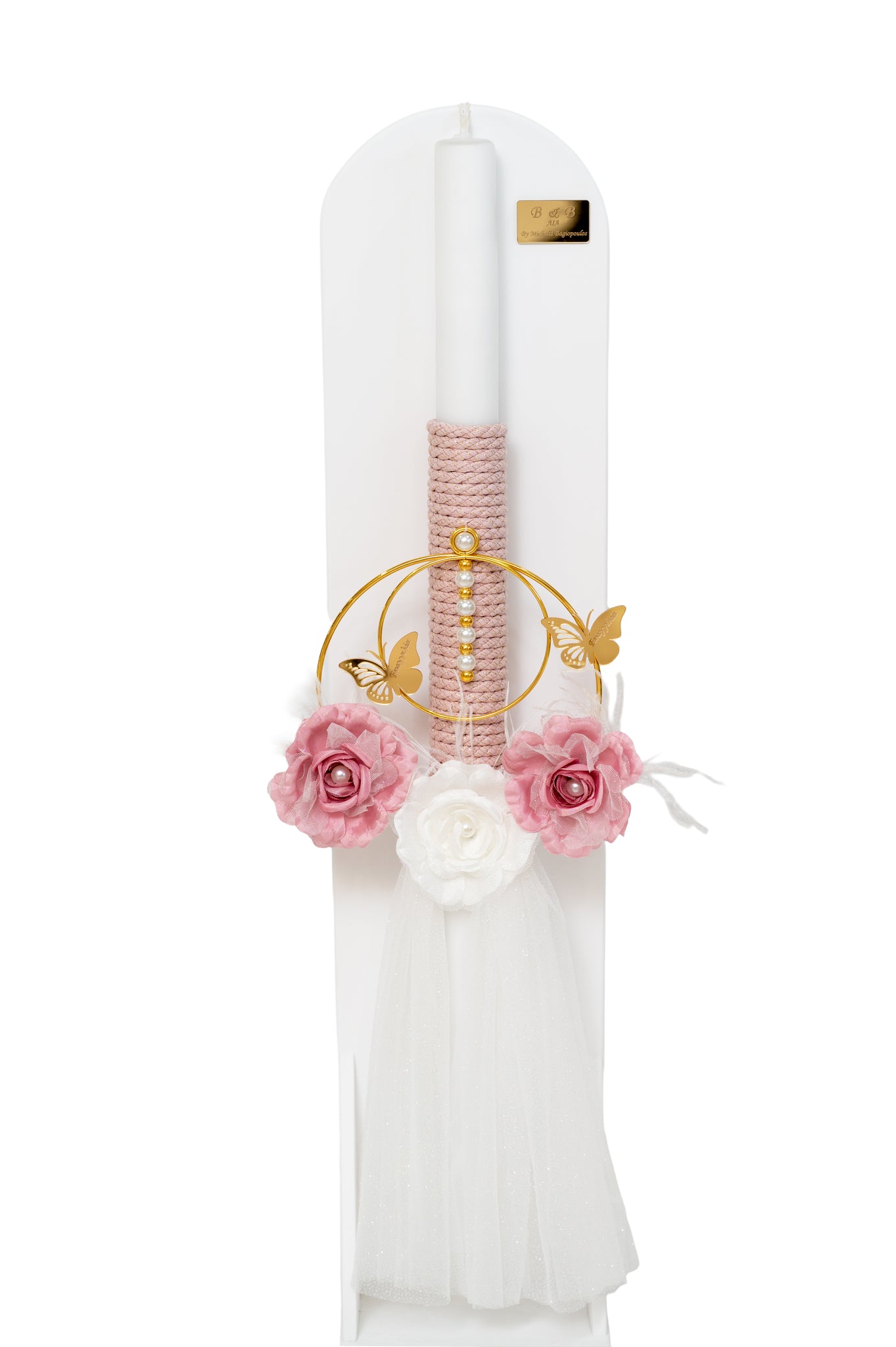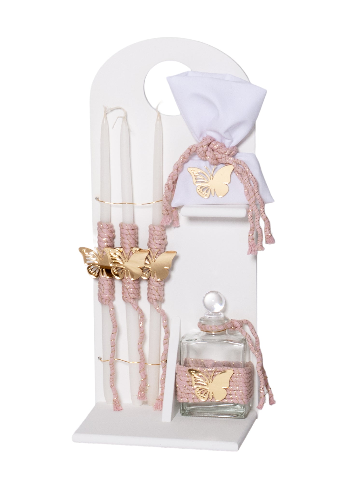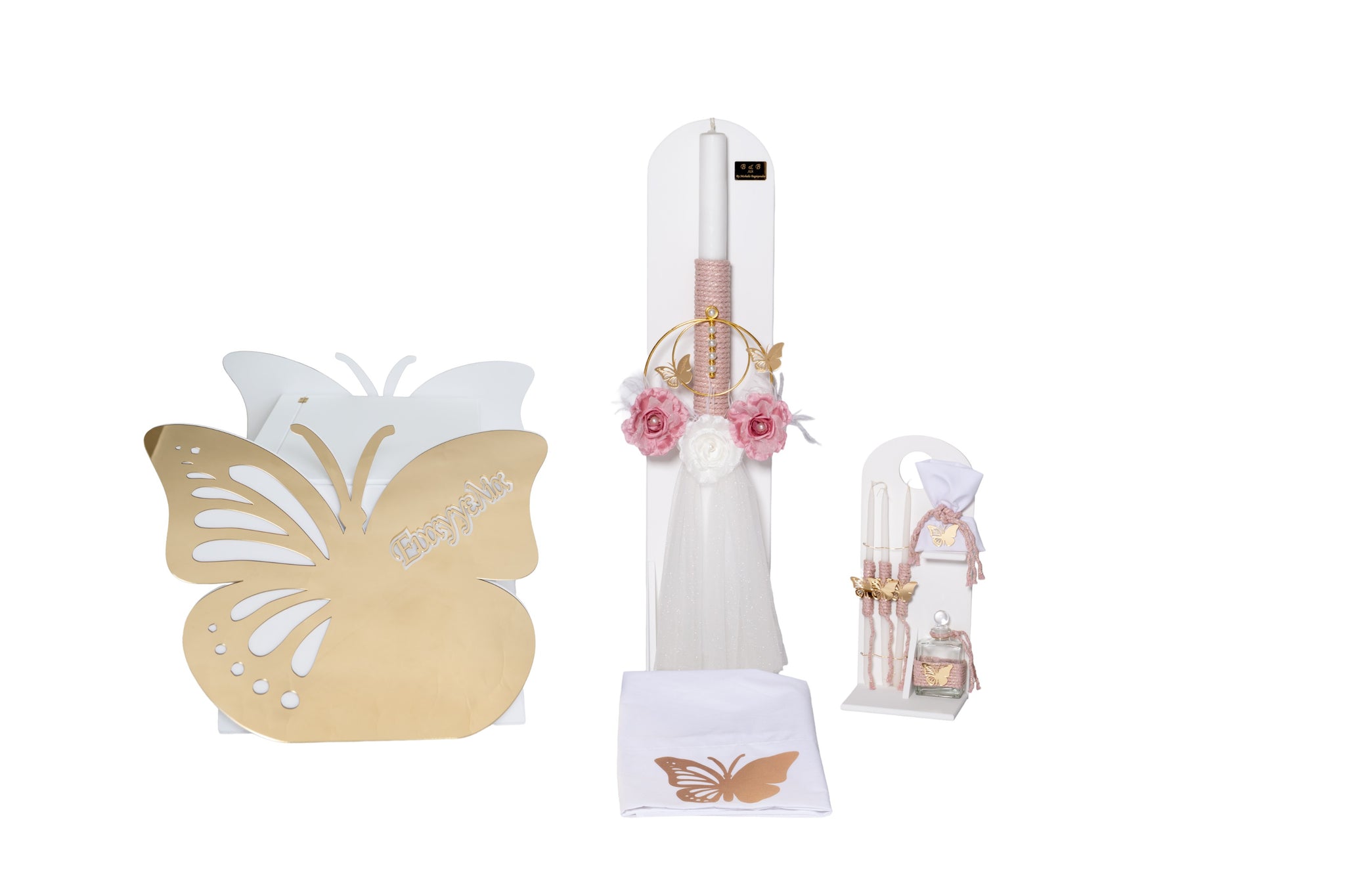 Σετ βάπτισης κορίτσι με θέμα Πεταλούδα και το όνομα του παιδιού.